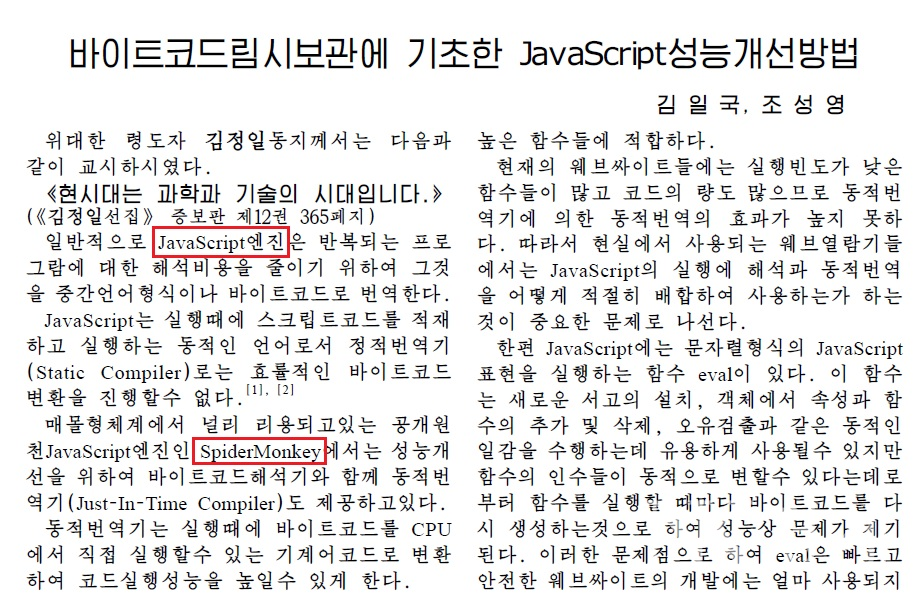글은 제안한 방법을 스파이더몽키에 구현하고 널리 이용되고 있는 3개의 웹사이트들을 대상으로 실험을 진행했다고 한다. 실험결과 스파이더몽키를 그대로 실행시킬 때에 비해 전체 실행시간을 14.9%로 단축할 수 있었다고 한다. 즉 북한 연구원들은 웹 성능을 개선하기 위해 이런 연구를 진행한 것이다. 자바스크립트와 스파이더몽키를 사용하고 있기 때문에 이를 기반으로 연구한 것으로 추정된다.