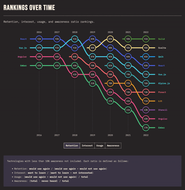 Svelte와 솔리드는 각각 89%, 90%로 유지율 선두를 차지했다. 리액트의 유지율은 2019년 89%에서 83%로 떨어졌다. 앵귤러 유지율은 같은 기간 약간 증가해 42%에 도달했지만 전성기인 2016년 68%에 여전히 미치지 못한다.