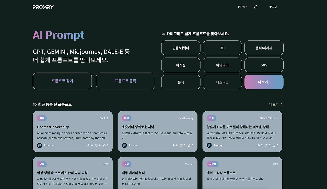 각 카테고리마다 프롬프트를 검색할 수 있어 내가 원하는 프롬프트를 직관적으로 찾아 볼 수 있습니다.